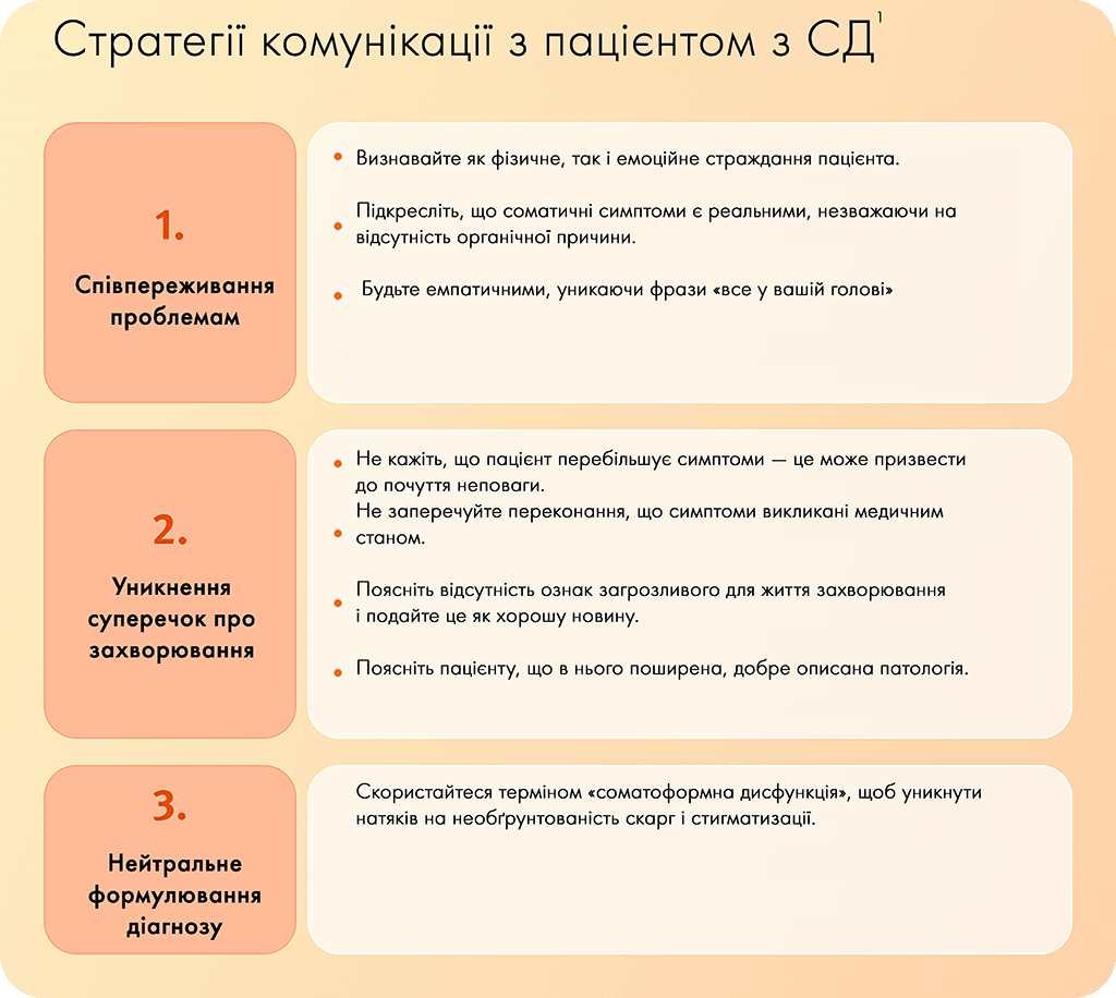 У веденні соматоформної дисфункції важлива не лише точна діагностика, а й партнерський союз між лікарем і пацієнтом1,2. Сучасні комунікативні стратегії дають змогу встановити міцний контакт і можуть відчутно впливати на ефективність терапії.