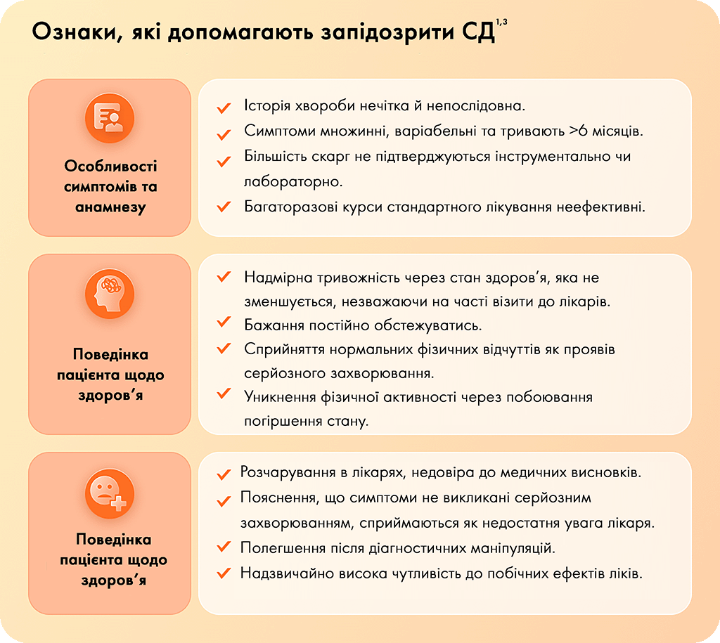 Діагностувати СД можна, виключивши органічну причину симптомів1. Але є ознаки, які допоможуть запідозрити СД у пацієнтів з безліччю нечітких скарг із тривалим перебігом на фоні підвищеної тривожної симптоматики3.