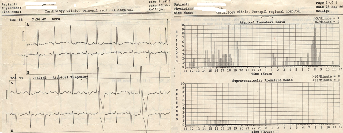 Подальше спостереження. Особливістю порушення риму була схильність до алоритмії, окремі ектопічні комплекси мали різну направленість, періодично були різнофокусні, а іноді – спарені; загалом домінувала шлуночкова екстрасистолія (ШЕ) порівняно із надшлуночковою. Згідно з даними чисельних досліджень добового ритму, фіксувалися екстрасистолії класу 3‑4 за класифікацією Lown, при цьому середньодобова частота